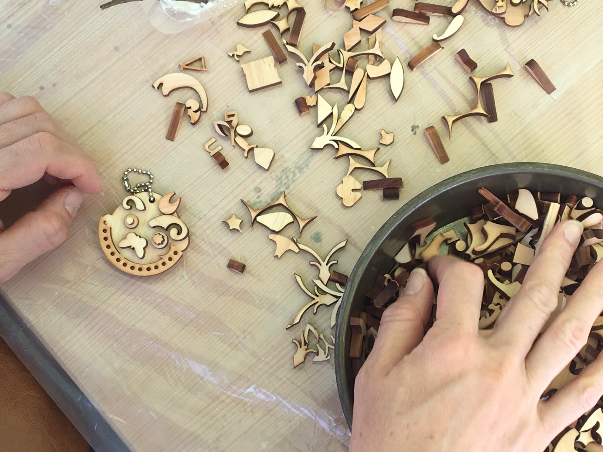 三重県産のヒノキのパーツを組み合わせて、”福笑いキーホルダー”を作ります。