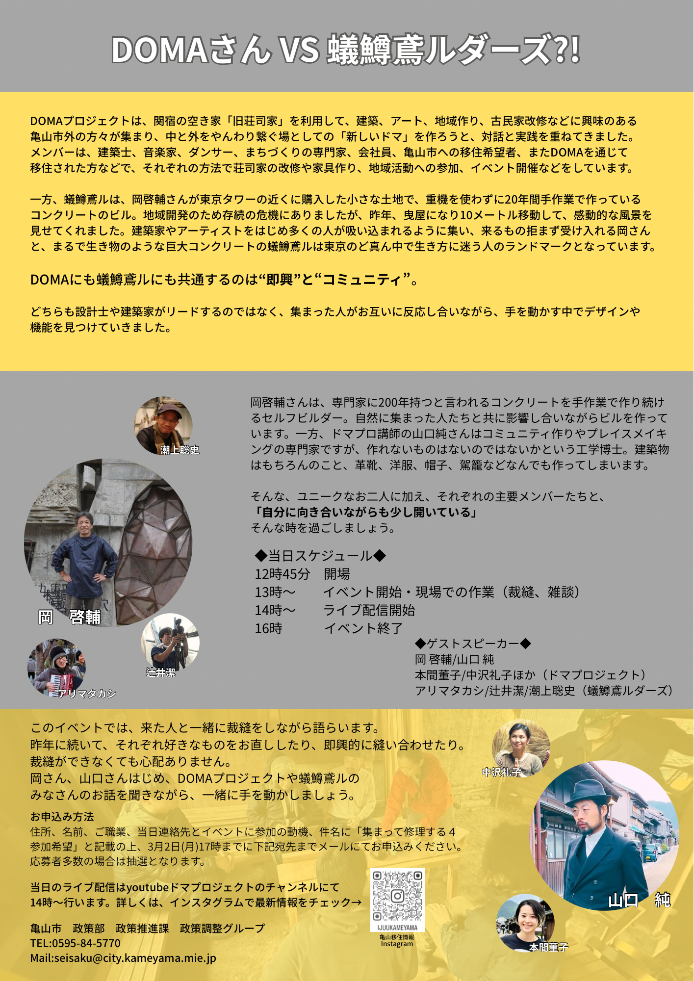 このイベントは亀山市空き家活用・関係人口トライアル「DOMAプロジェクト」の空気感を東京で感じてもらおうというもので、DOMA プロジェクトをファシリテートする山口純さんとDOMAメンバーたちに加え、「蟻鱒鳶ル(アリマストンビル)」建築家の岡啓輔さんと岡さんを支える現場の皆さんとチクチクしながら、コミュニティの成り立ちや現場のリアルを語ります。