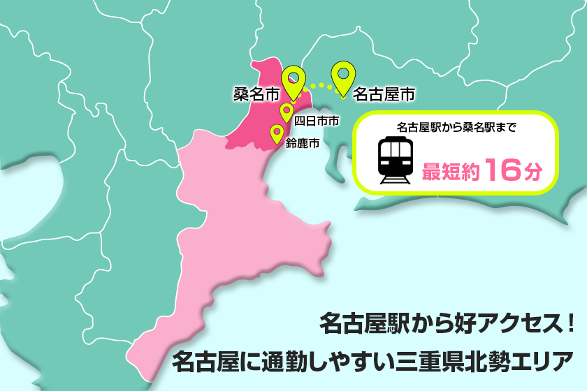 三重県北勢エリアは、桑名市・四日市市・鈴鹿市などを含む地域で、名古屋から電車や車で約15〜40分圏内と好アクセス。