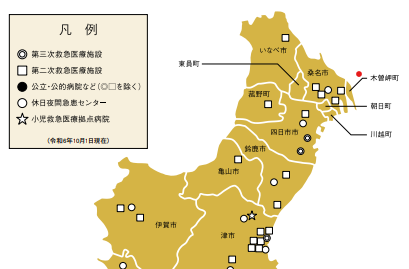 北勢エリアには、24時間365日の高度な医療体制を有する第3次救急医療施設をはじめとした大きめの医療施設が多数存在しています。