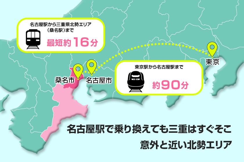 三重県北勢エリアは、ナガシマスパーランドのある桑名市や鈴鹿サーキットのある鈴鹿市、コンビナート夜景で有名な四日市市などを含む三重県の北部の地域で、名古屋から電車や車で15分〜40分圏内と好アクセス。