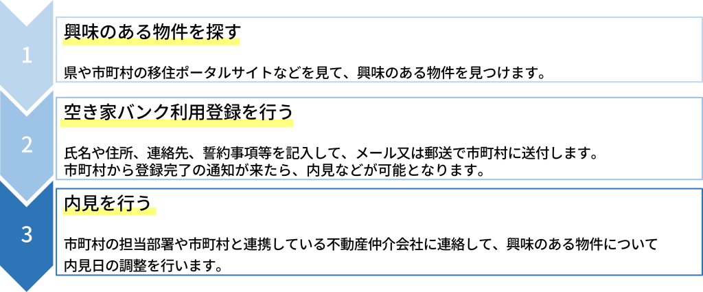 空き家バンクの一般的な利用方法については、下記をご覧ください。※利用方法は自治体によって異なりますのでご留意ください。